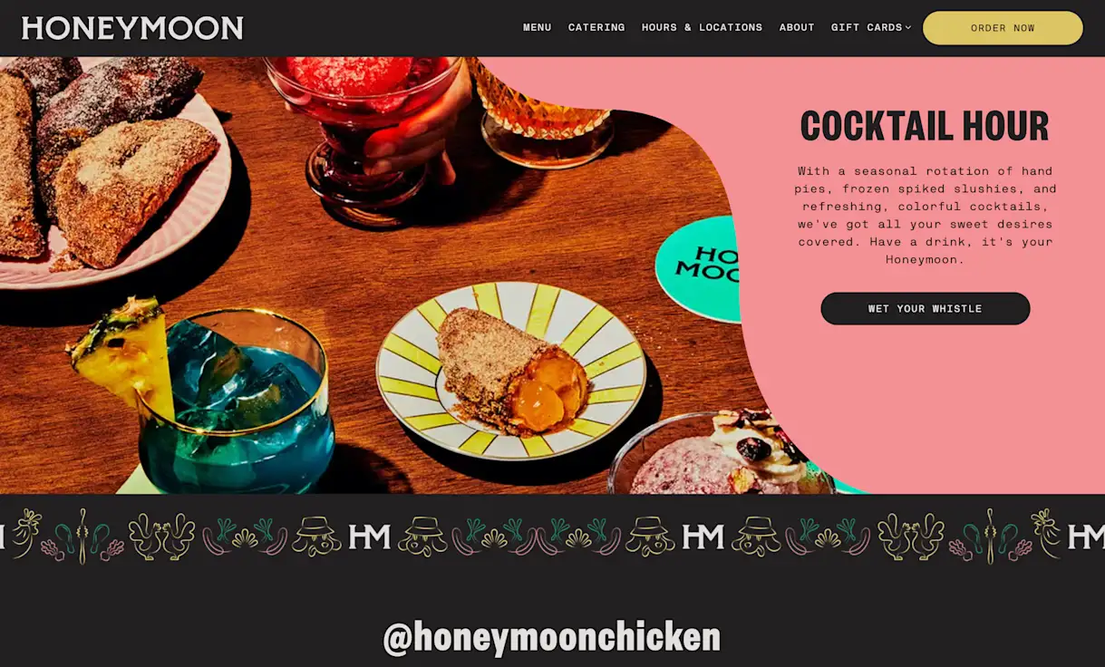 Hierarchy is about ranking different design elements to lead the user’s eye effectively through a design, and it can be leveraged via the other design principles we’ve discussed here. Honeymoon Chicken uses many design elements to help make information easy to access and keep the user scrolling on their page. The top navigation has key links, and a bright, contrasting button gets users to order food easily. The homepage alternates between full and split overlays with color and photography, which helps to clearly provide information about things like reservations and happy hour. ~Groovy~ color blocks in the split overlays help bring the eye down the page as well.
