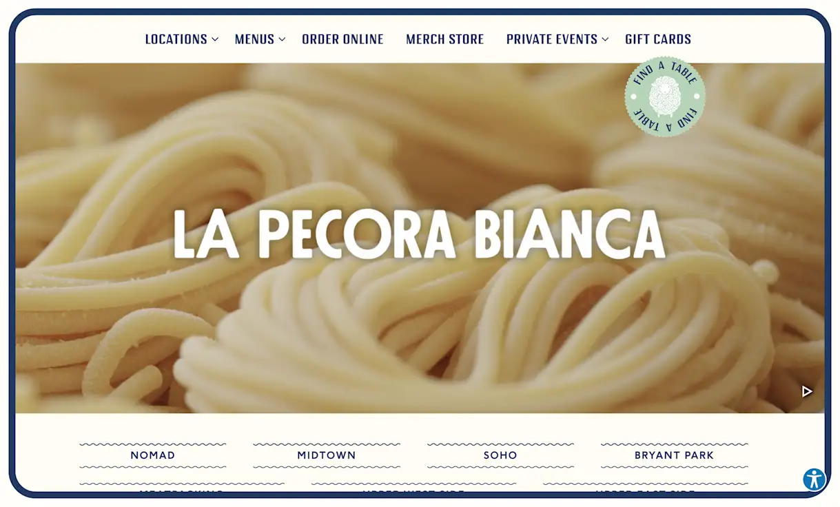 Repeating various design elements can help drive home what a brand is all about. La Pecora Bianca is a charming Italian restaurant whose website shows many simple, repetitive patterns throughout. When the page loads, it immediately shows you what the establishment serves with a fun, tiled pasta pattern that swipes up to reveal the page. Squiggly lines that make you think of pasta shapes repeat throughout the website, whether as a link hover or a footer element.