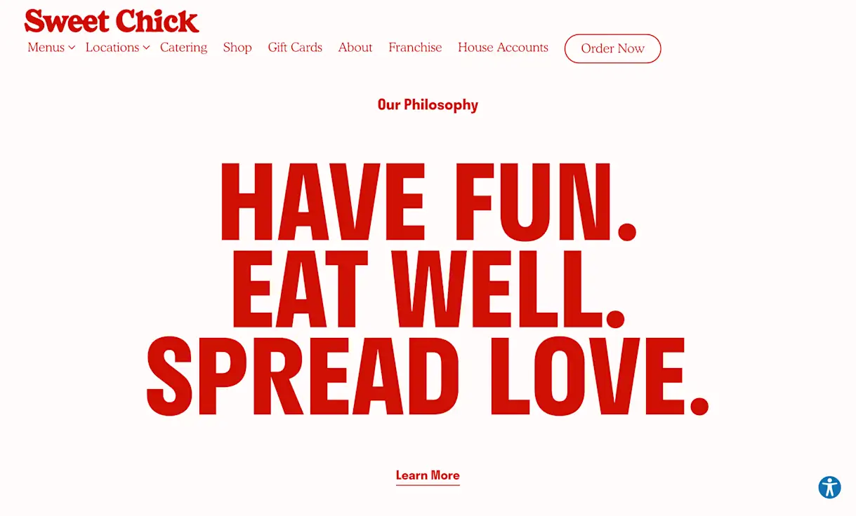 A great way to create emphasis in a design is through tools like size, weight, position, and color. There are few ways this happens on the Sweet Chick website. One of the most dominant techniques is the comparison of the oversized headings in relation to the rest of typography. In this instance, you also feel the sharp contrast of the deep red color on the off white background. Going back to scale, it is also noticeable that all the images on the website, as well as graphic assets like the map marker, are large and in charge.