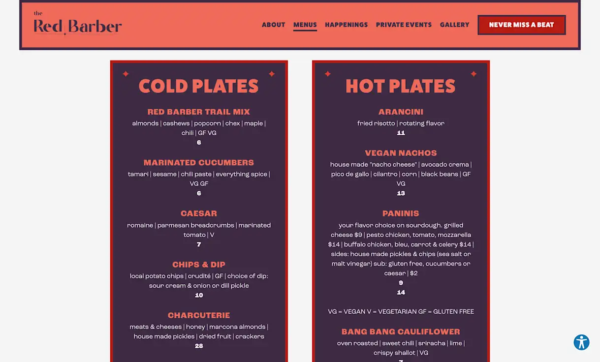 All design elements have visual weight, and a sense of balance can be achieved with symmetry and asymmetry. The Red Barber is a swanky rooftop bar in Denver whose website manages to achieve perfect balance with varying page elements. The homepage alternates between full-width photo carousels and smaller content boxes for their menu and happenings. Their menu page is another great example of visual balance using colors and icons. The deep red and purple colors make each column feel balanced with one another.