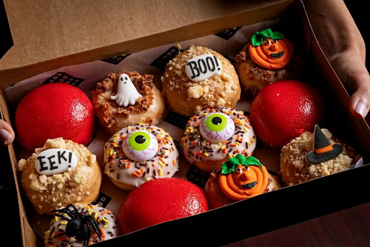 For donut shops or restaurants with a pastry program, special seasonal donuts are a way to get into the Halloween spirit. Flavors like Pumpkin Pie and Candy Apple are on theme, and adding fake spiders or eyeballs on top is extra festive. Astro Doughnuts in the D.C. area serves up a mini box each October.