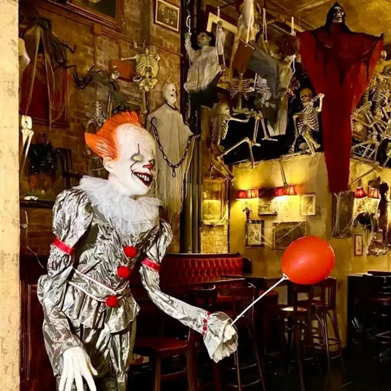 Restaurants that want to lean into the horror side of Halloween can decorate with characters from scary films. Lillie’s Victorian in New York City uses a statue of Pennywise from the movie It to bring a little extra terror into their dining room.