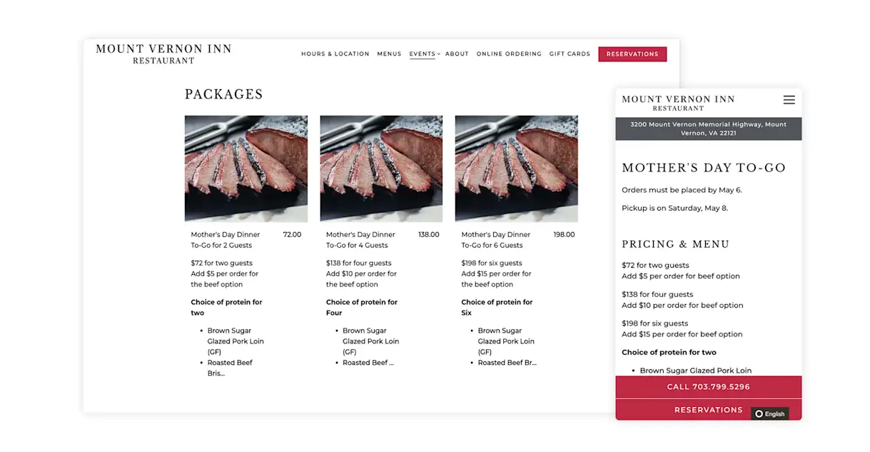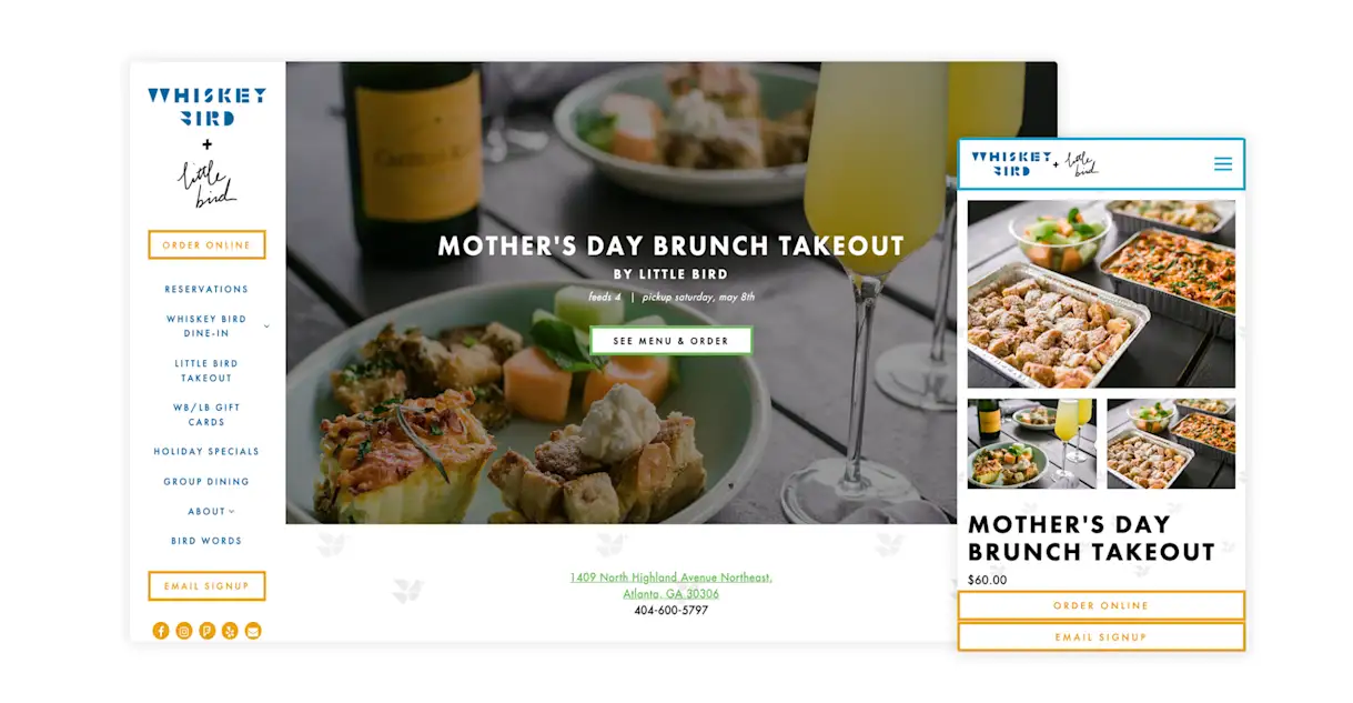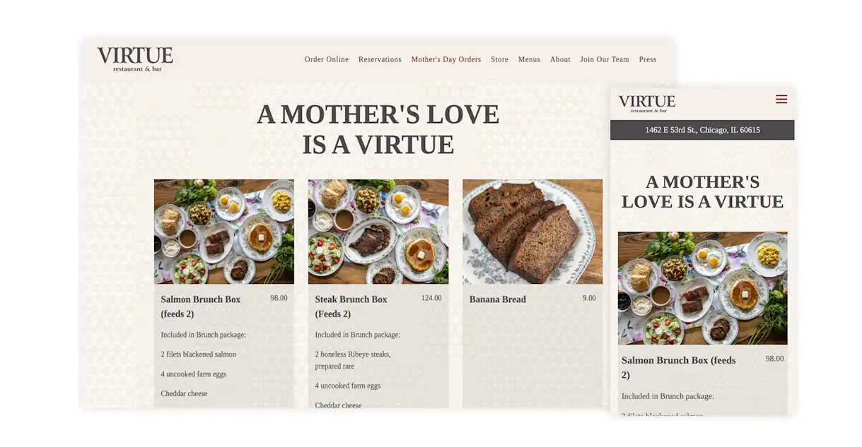 Chicago’s Virtue offers its guests Mother’s Day brunch boxes such as the “Salmon Brunch Box” and “Steak Brunch Box,” which both feed two people. To promote more orders, Virtue adds its offerings to the navigation menu of the website under “Mother’s Day Orders”. We can’t help but love their play on words with the headline, “A Mother’s Love is a Virtue.”
