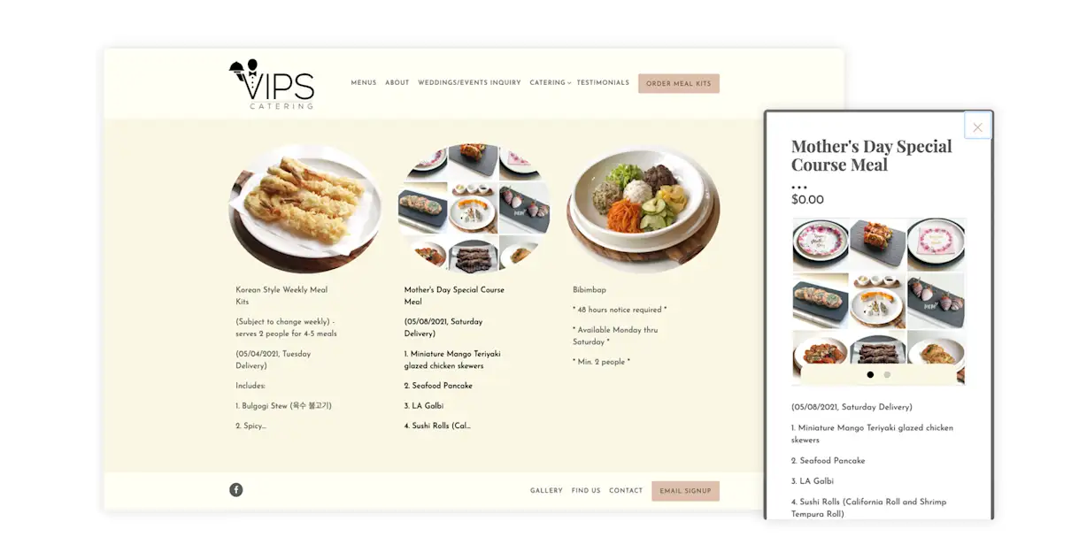 Coming from a strong culinary and banquet background, VIPS Catering is a full-service catering company strategically located in the heart of D.C. Visitors to the site can navigate to their online catering store under the “Order Meal Kits” button where they’ll find an array of catering options. Guests can order their Mother’s Day Special Course Meal with options like sushi rolls, seafood pancakes, and chicken skewers.
